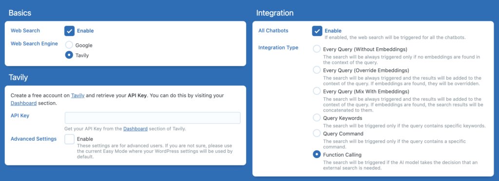 This add-on for AI Engine enhances the AI modelsâ responses by incorporating additional context. It currently supports Google Search and Tavily.